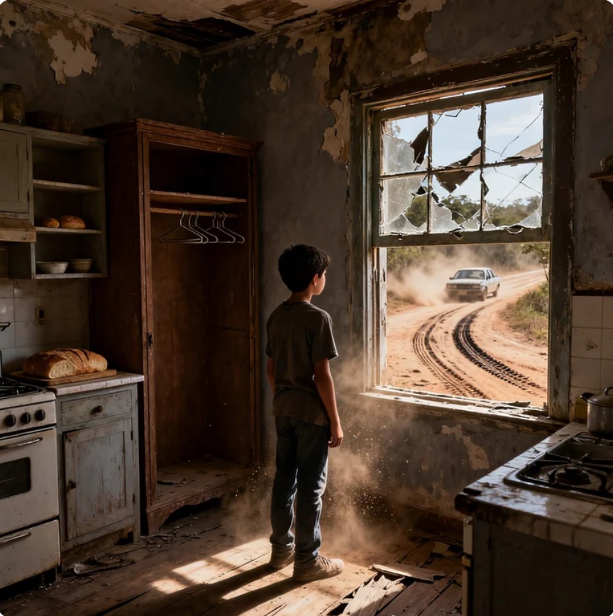 Mateo, con apenas doce años, estaba de pie frente a la ventana rota de la cocina.