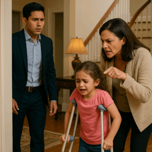 Victoria, elegante en su vestido de seda, se giró sorprendida. Sofía estaba en el suelo, con lágrimas surcando sus mejillas y las muletas tiradas a un lado.