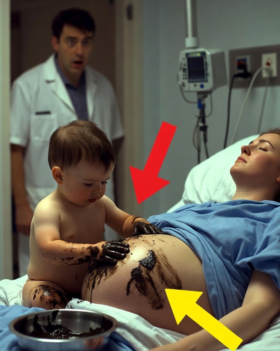 En una habitación clínica, una mujer embarazada yacía inconsciente mientras un niño pequeño, con total calma, cubría su vientre con barro oscuro usando sus propias manos.