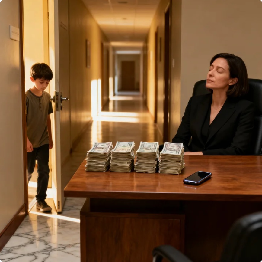 Cuatro fajos de billete sobre el escritorio, un celular y un niño que acaba de entrar en silencio al despacho