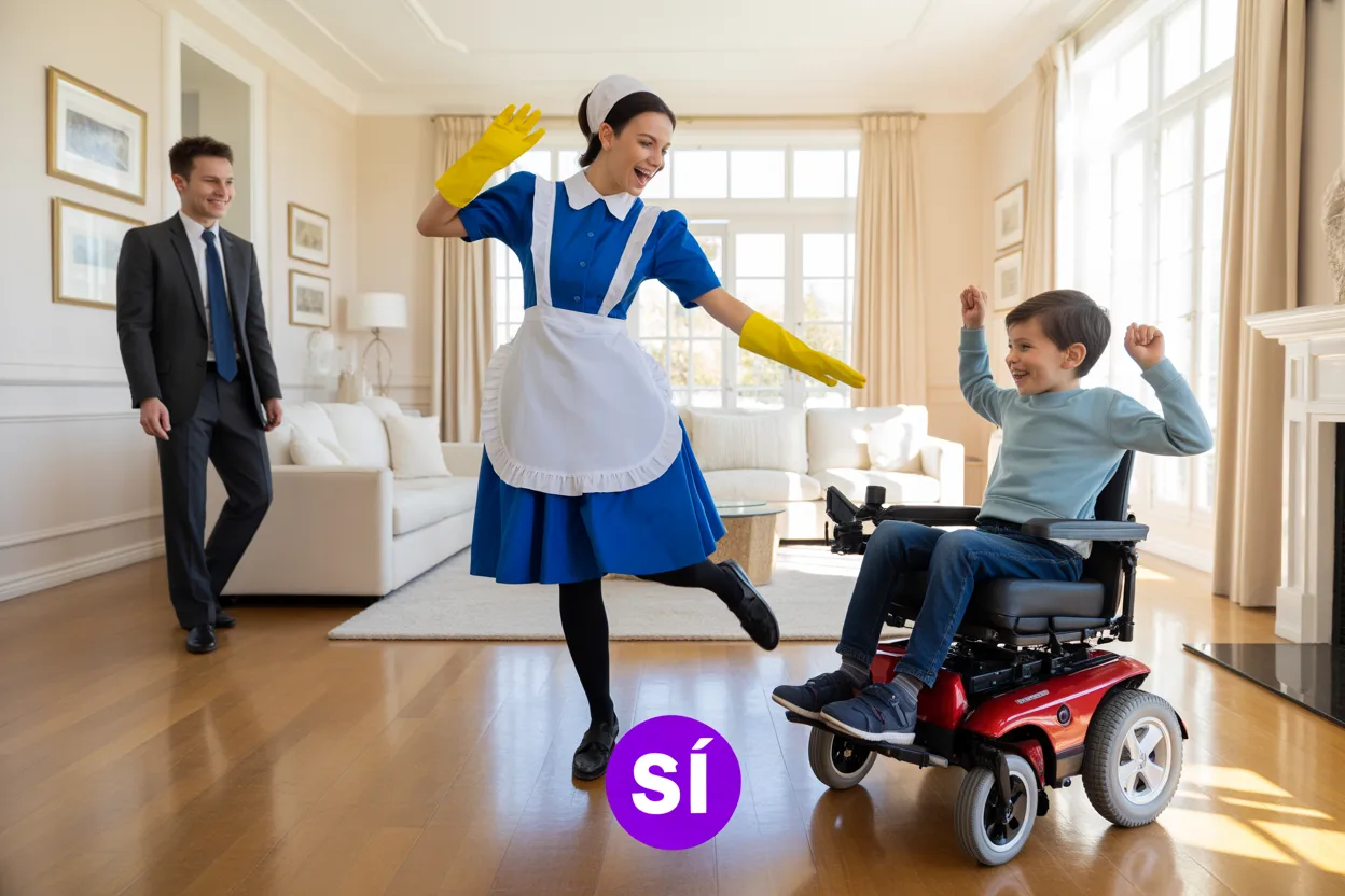 Santiago siente algo que no sentía hace dos años. Esperanza de verdad. Tres días después, la rutina especial de Camila con Mateo ya se volvió tradición. Transformó la limpieza de la casa en una gran aventura. Por las mañanas empuja su silla por la casa inventando historias sobre todo. El florero de la sala se convierte en castillo. La lámpara se convierte en nave espacial.