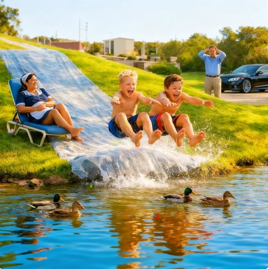 por un tobogán inflable que cae directo al lago, mientras una mujer joven los observa sonriendo desde una silla de