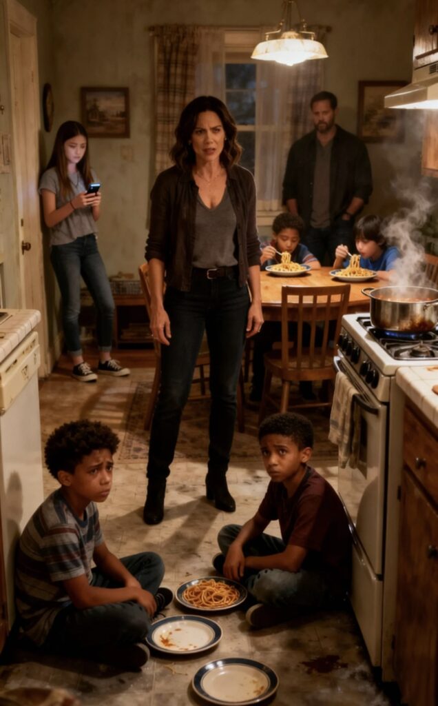 Mis hijos, Jamie y Tyler, estaban sentados en el suelo de la cocina, con las piernas cruzadas, mirando tristemente sus sándwiches secos de mantequilla de maní. Mientras tanto, los hijos de mi hermana Jessica ocupaban la mesa, con platos de espagueti humeante y vasos de leche que brillaban bajo la luz del comedor.