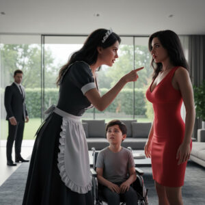El niño en silla de ruedas de 7 años intentaba contener el llanto mientras su madrastra lo humillaba sin piedad. Pero antes de que ella dijera algo peor, la empleada doméstica apareció en la puerta y gritó, “¡No hagas eso.” La voz resonó por toda la sala. El millonario, que acababa de llegar, quedó paralizado al ver la escena.