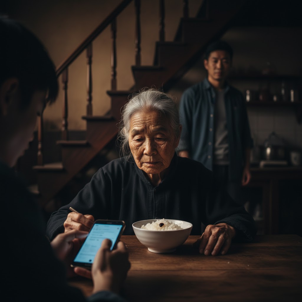 Frente a ella, un tazón pequeño de arroz blanco ya frío, con apenas unas gotas de salsa.